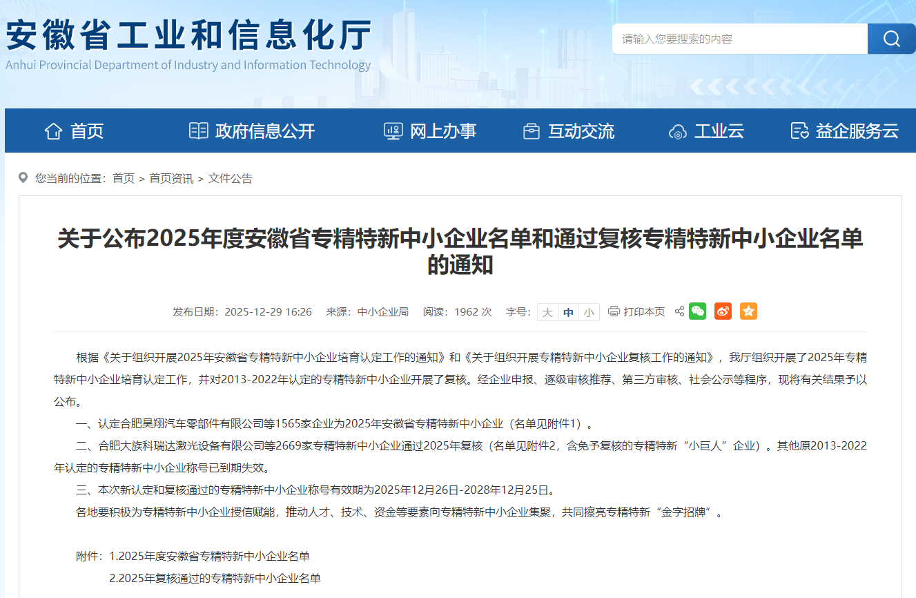 近日,安徽省工业和信息化厅完成了2025年度专精特新中小企业培育认定及历史批次复核工作。在此次复核评选中,我安徽誉特双节能技术有限公司,凭借长期深耕高耗能工业企业热工系统节能技术及资源综合利用领域的卓越成就,再次成功入选安徽省专精特新中小企业序列。